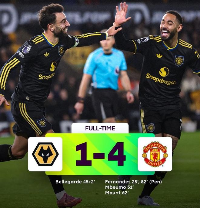 第51分钟曼联再度领先,当时库尼亚送直塞,达洛特面对门将选择分球给队友,姆伯莫右脚推射空门得手。第62分钟,B费和阿玛德的配合,后者回敲帮助B费完成一次射门,随后二次进攻中,B费拿球选择传到禁区助攻芒特将比分改写为3比1,这也登顶锁定了胜局。第82分钟阿玛德造耶森·莫斯克拉手球,B费主罚点球命中让对手只能接受一场惨败。